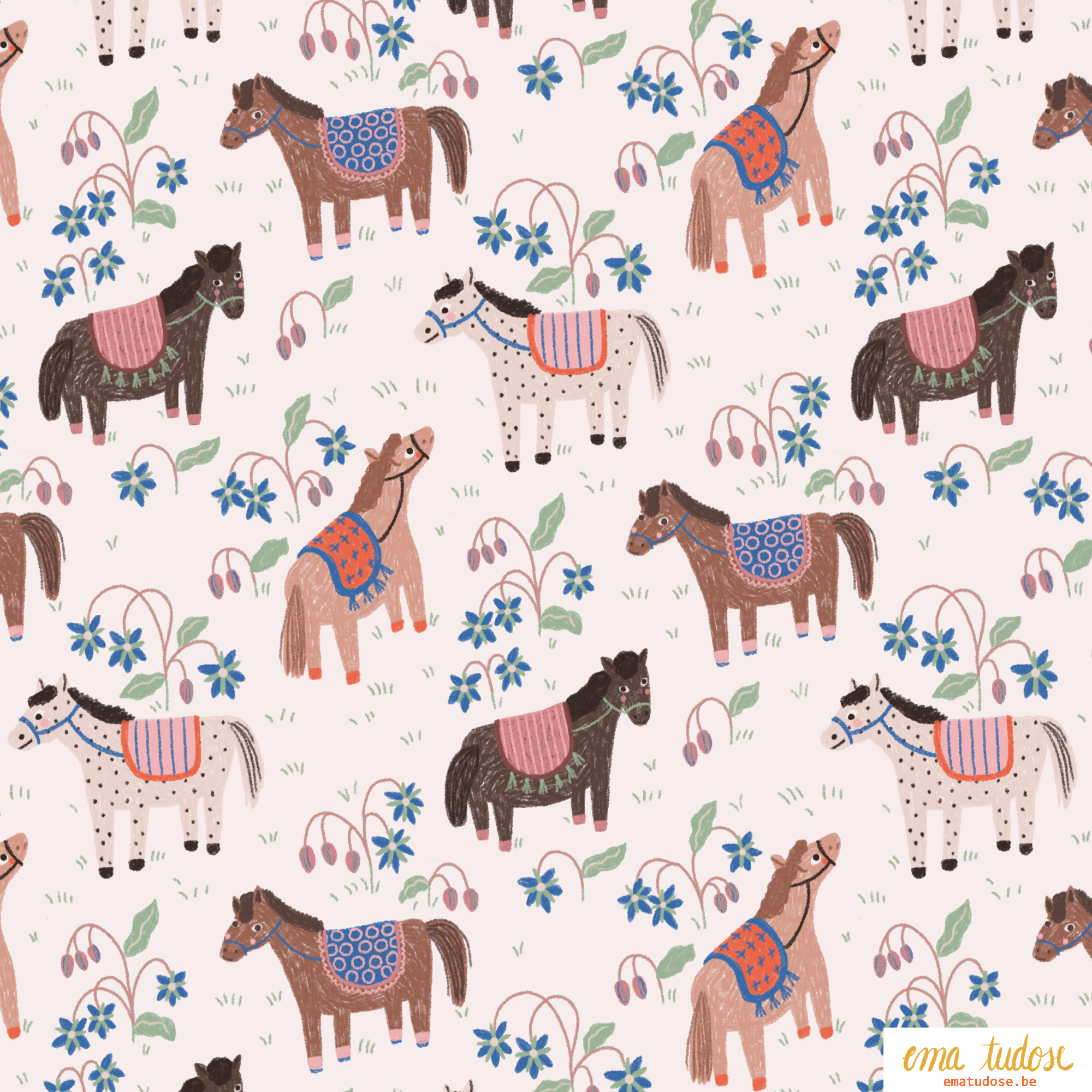 Horses! I love the look in their eyes, especially the darkest brown horse. I always strive to create some subtle interaction among the characters in my patterns, and also an interaction with the viewer. The dark brown horse is looking at the viewer with an expression that is a mix of chagrin and surprise, which is mostly the result of a happy little accident.