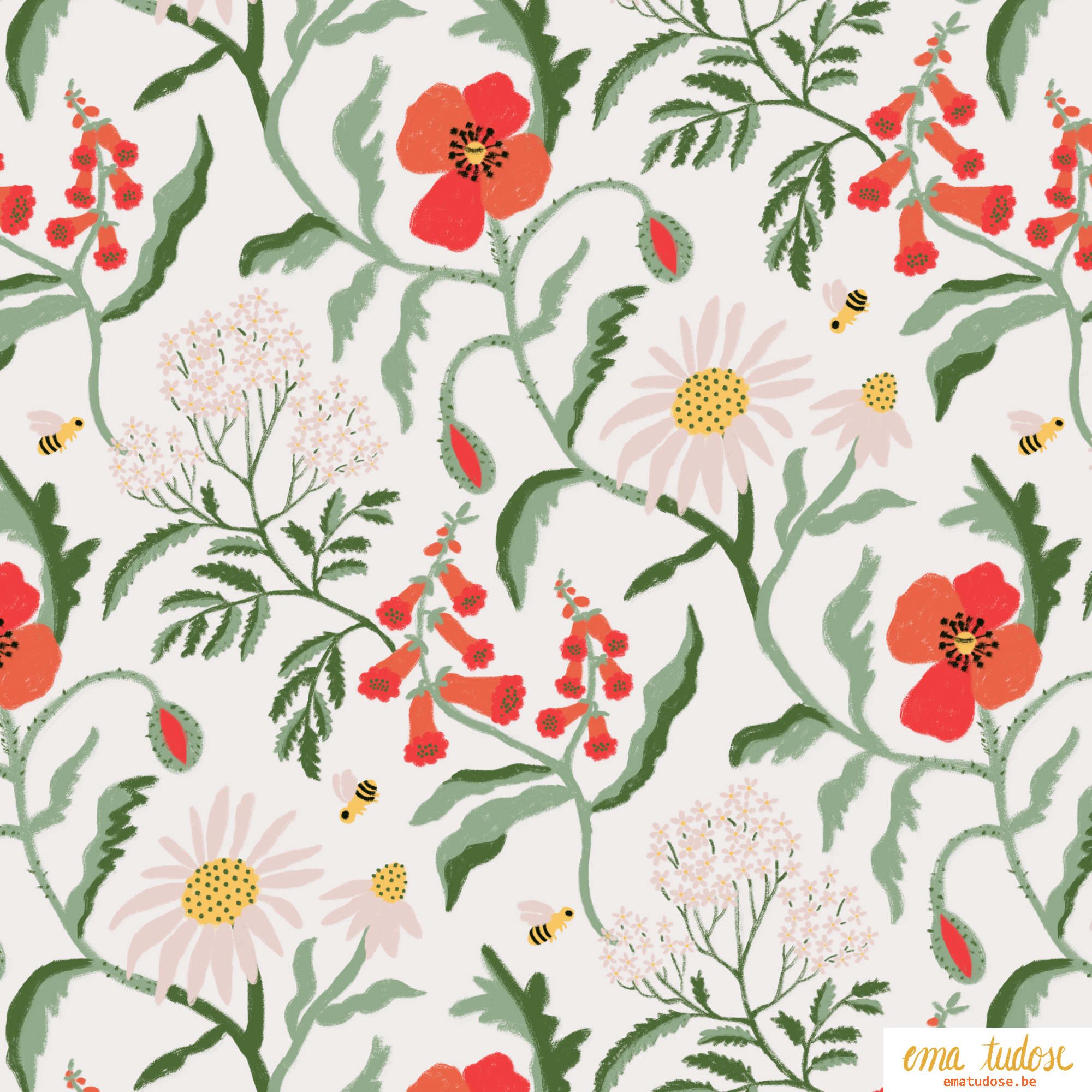 Once I choose a subject, I usually do several observational sketches on the iPad or on paper that I can use as references when I start drawing the pattern. I generally choose the color scheme at this stage as well. The color scheme often drives the pattern, although it sometimes changes more or less dramatically along the way. For example, the last flower pattern was originally meant for a dark background, but I completely changed it to a very light one. I also adjusted the colors of some flowers when I realized that the red flowers formed too strong a linear structure. In the light-background version, which I consider my final for now, the colors are less grouped and more evenly spaced, creating, in my opinion, more balance and breathing space.